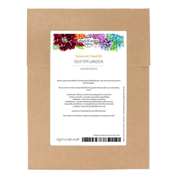 • Dieses Samenset enthält Muskatellersalbei, Duftnessel, Echter Lavendel, Duftwicke, Vanilleblume, Nachtkerze und Levkojen
